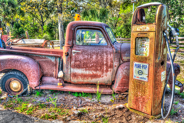 Rusty old truck waiting for a fill up in Perry, Florida. HDR image with a grungey affect applied.
